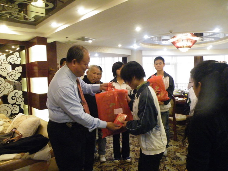 基金會理事長給學(xué)生們送衣服和紅...